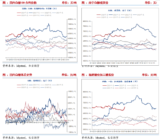 2023-24年制糖期全国共生产食糖996.32万吨,同比增加99万吨,增幅11.03%。截至6月底,全国累计销售食糖738.34万吨,同比增加50.52万吨,增幅7.34%;累计销糖率74.11%,同比放缓2.54个百分点。其中6月份单月销糖79.06万吨,同比增加16.06万吨,去年同期单月销糖处于低位。广西南宁现货价格6月以来变化不大,基层普遍有高价惜售的心态,整体维持在6500元/吨附近徘徊。食糖工业库存257.98万吨,同比增加48.43万吨,增幅环比降低,且仍处于2016年以来的次低位,或支撑糖价。