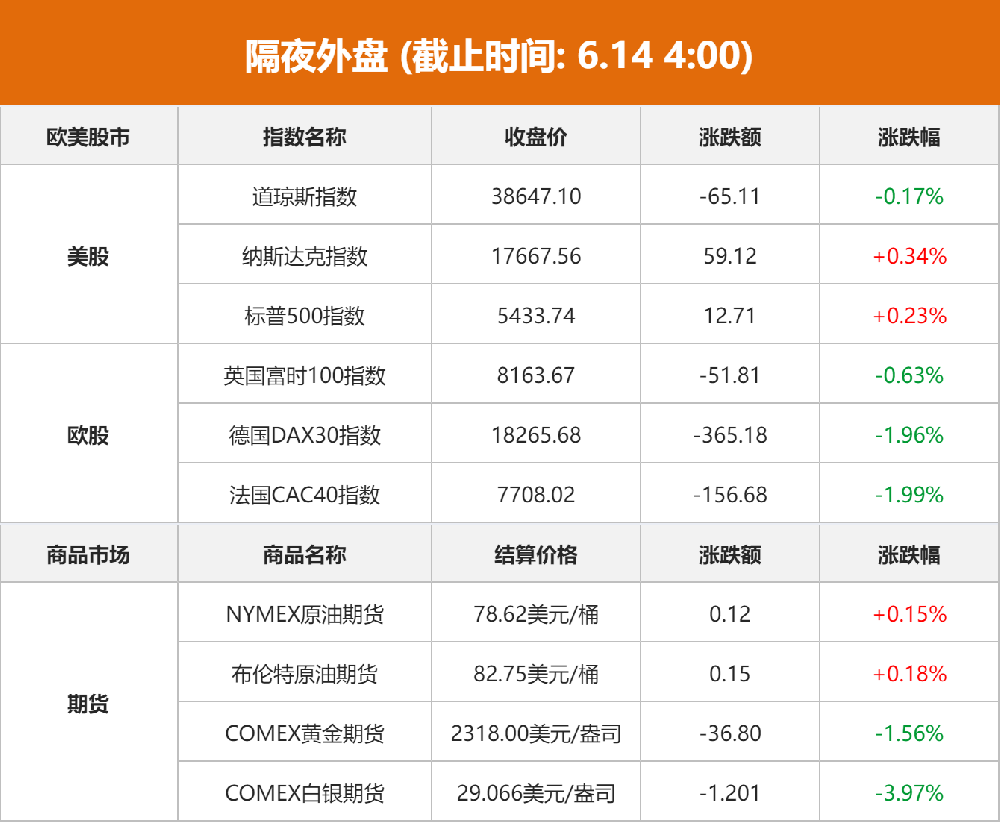 美股市场:美股三大指数涨跌不一,纳指、标普连续四日创收盘新高,截至当天收盘,道琼斯工业平均指数比前一交易日下跌65.11点,收于38647.10点,跌幅为0.17%;标准普尔500种股票指数上涨12.71点,收于5433.74点,涨幅为0.23%;纳斯达克综合指数上涨59.12点,收于17667.56点,涨幅为0.34%。